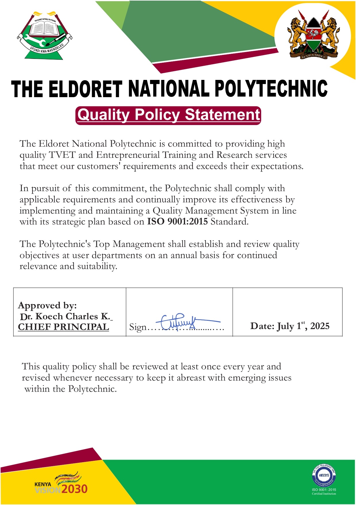 The Eldoret National Polytechnic (TENP) is proud to be ISO 9001:2015 Certified Institution. TENP was awarded the Quality Management System Certificate on 30th June 2014 by The Kenya Bureau of Standards after auditing TENP's Quality Management System after a long journey towards certification dating back to 2009 when it started.